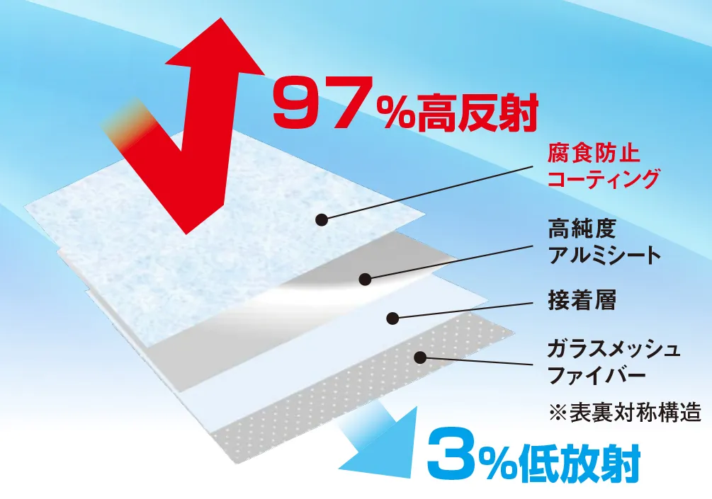 - ●輻射熱の97%を反射する両面アルミの遮熱・保温シート