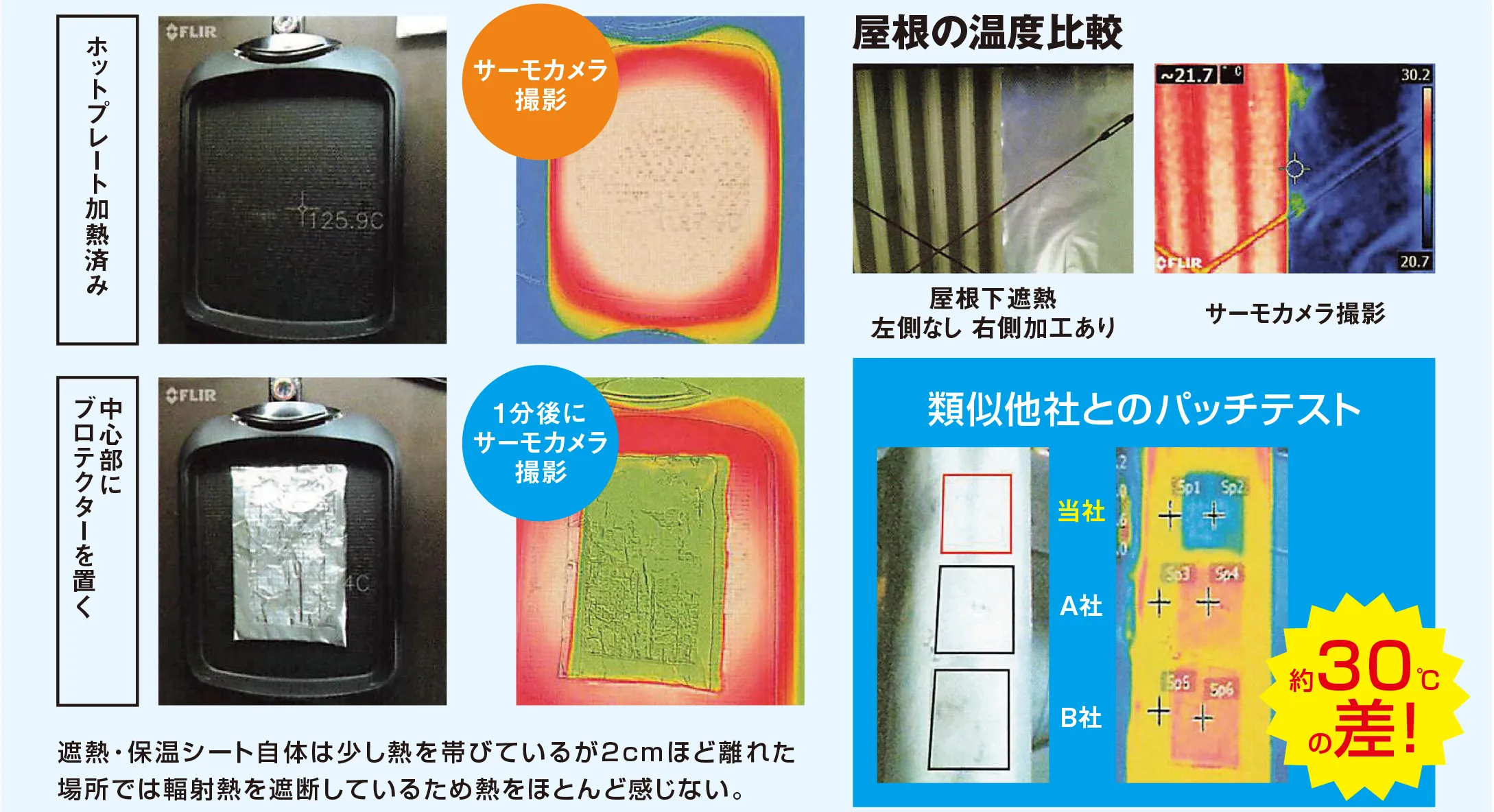 遮熱・保温シート自体は少し熱を帯びているが2cmほど離れた場所では輻射熱を遮断しているため熱をほとんど感じない。