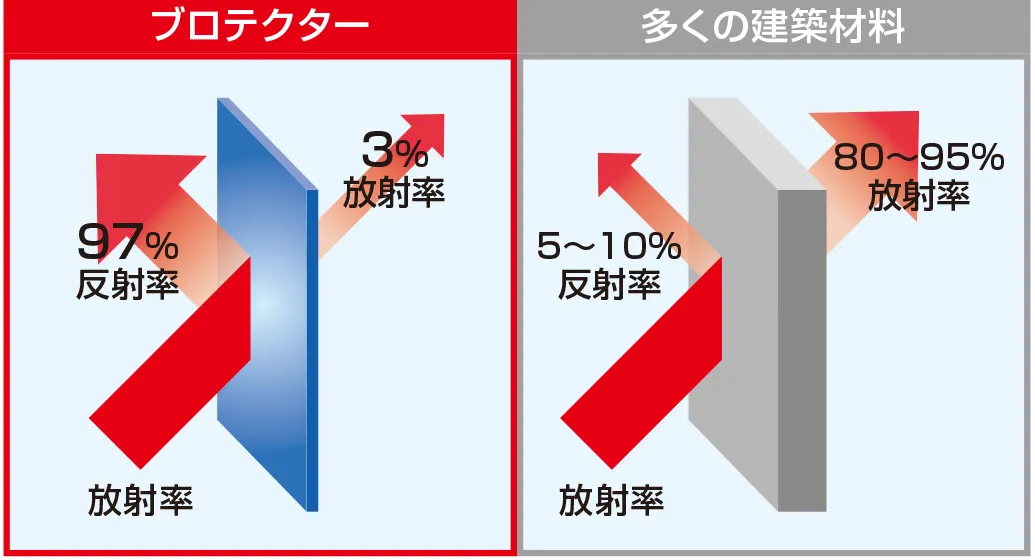 ブロテクターは断熱材では防げない輻射熱を97%反射する高品質な素材且つ、厚さ約0.23mmと薄く両面アルミというシンプルな構造を追求した高品質遮熱・保温シートです